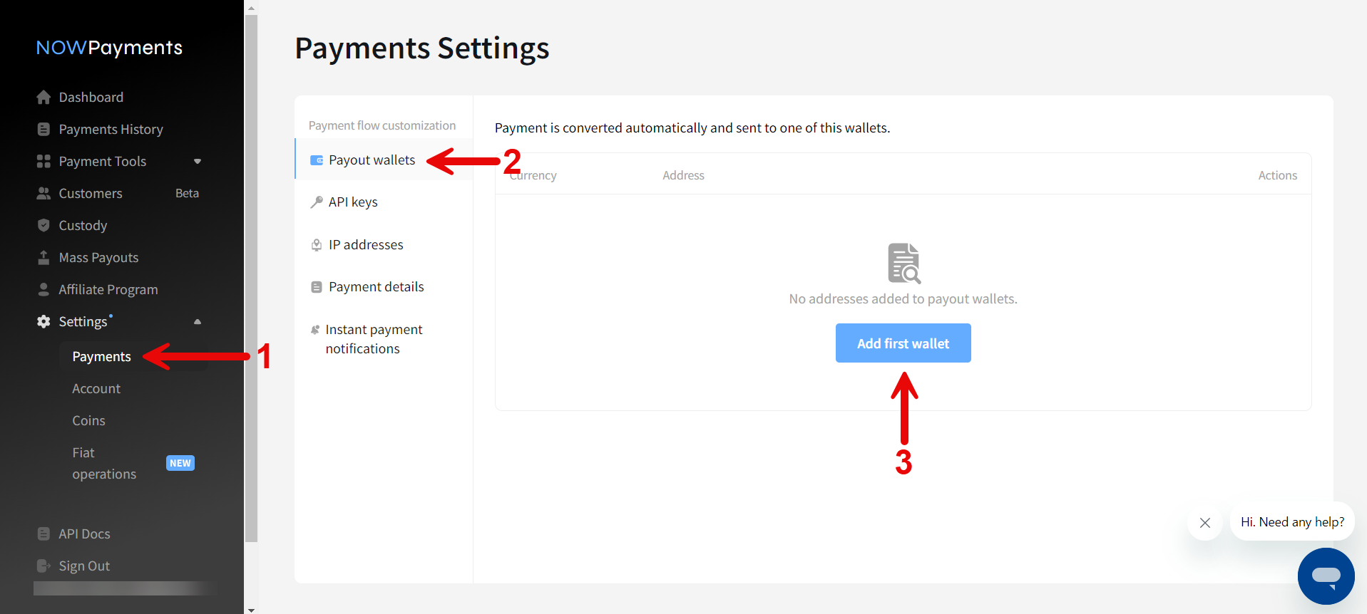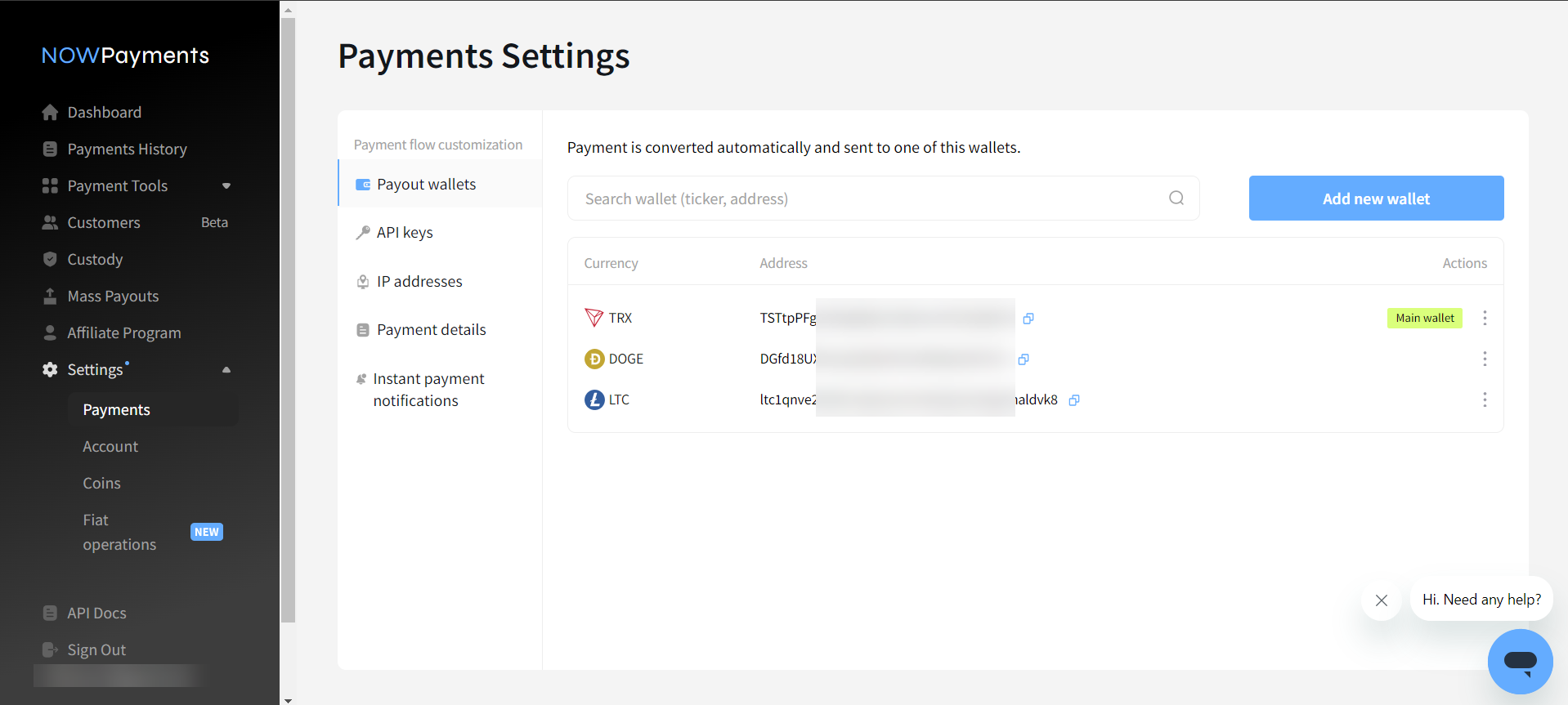 First, you need to add 3 wallets (TRX, DOGE, and LTC) in the NowPayments panel. This setup will ensure that any incoming payments are directly deposited into these wallets.